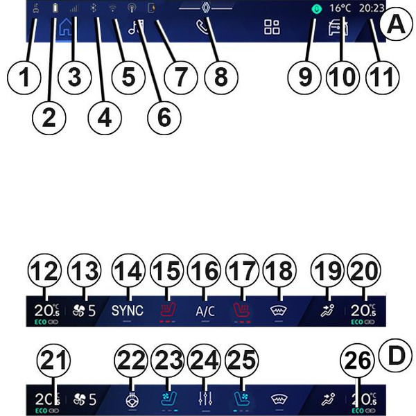 The Notifications centre E, which can be accessed using button 8, or by quickly swiping the multimedia screen from area A towards the centre of the screen, enables you to access the Notifications, "Profile" and some functions at any moment. To exit the Notifications centre, press 8 or swipe up quickly from the bottom of the screen towards the centre of the screen.