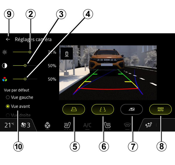 When the reversing camera is displayed on the multimedia screen, you can access the settings by pressing the "Settings" icon