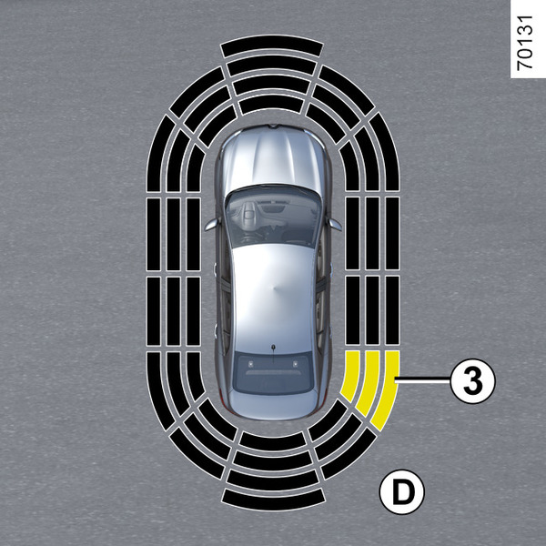 - Lydsignalet kommer raskere, og det lyder sammenhengende etter hvert som hindringen nærmer seg. Området der hindringen er oppdaget 3, vises (skjerm D).
